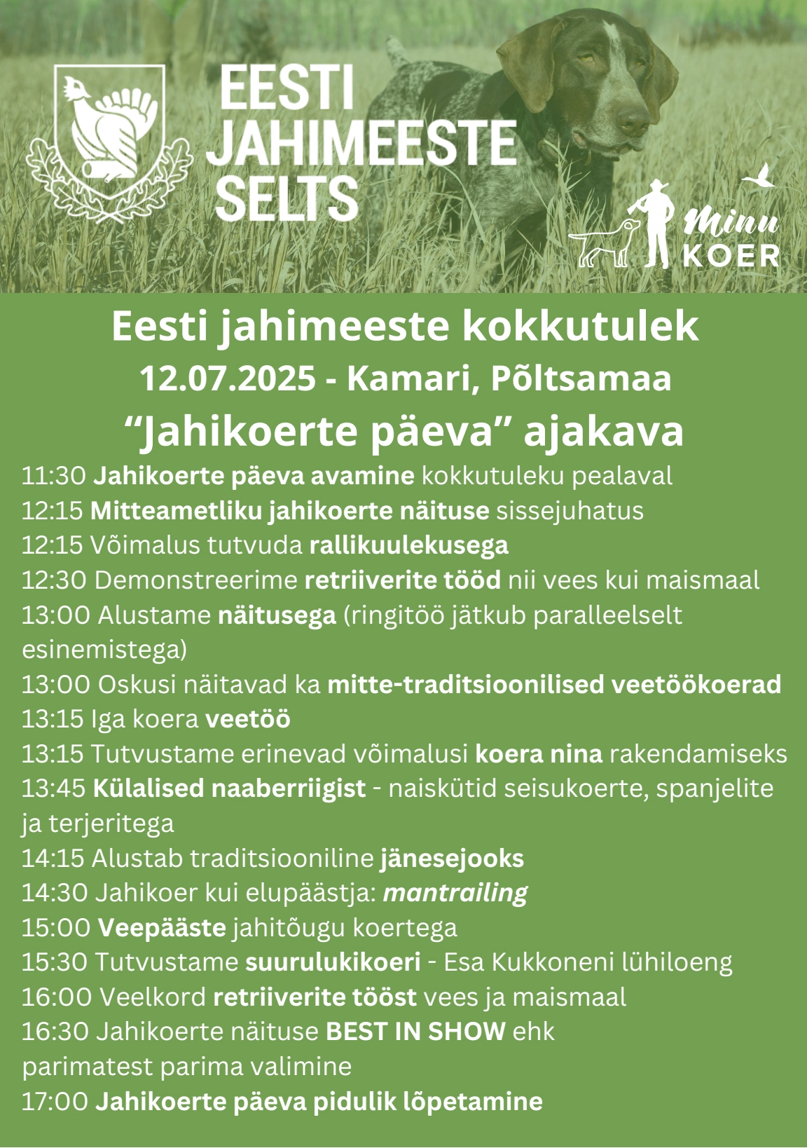 Tule näita rahvale oma ägedat jahikoera! Ning saa tuttavaks erinevate tõugudega, mida Eestis jahiks kasutada saab. Ning kes teab – ehk leiad endalegi uue lemmiku? Kohtunikuks on mitmekümneaastase staažiga aktiivne jahimees ja pikaaegne kasvataja Euroopast. Kuna tegemist on avatud näitusega, kus ametlikke serte ei jagata, siis on oodatud osalema ka nii kupeeritud kui ka teised jahitõugu koerad, kellel ametlikele näitustele muidu asja ei ole. Hea võimalus saada hinnang oma koerale ala tõeliselt asjatundjalt!
