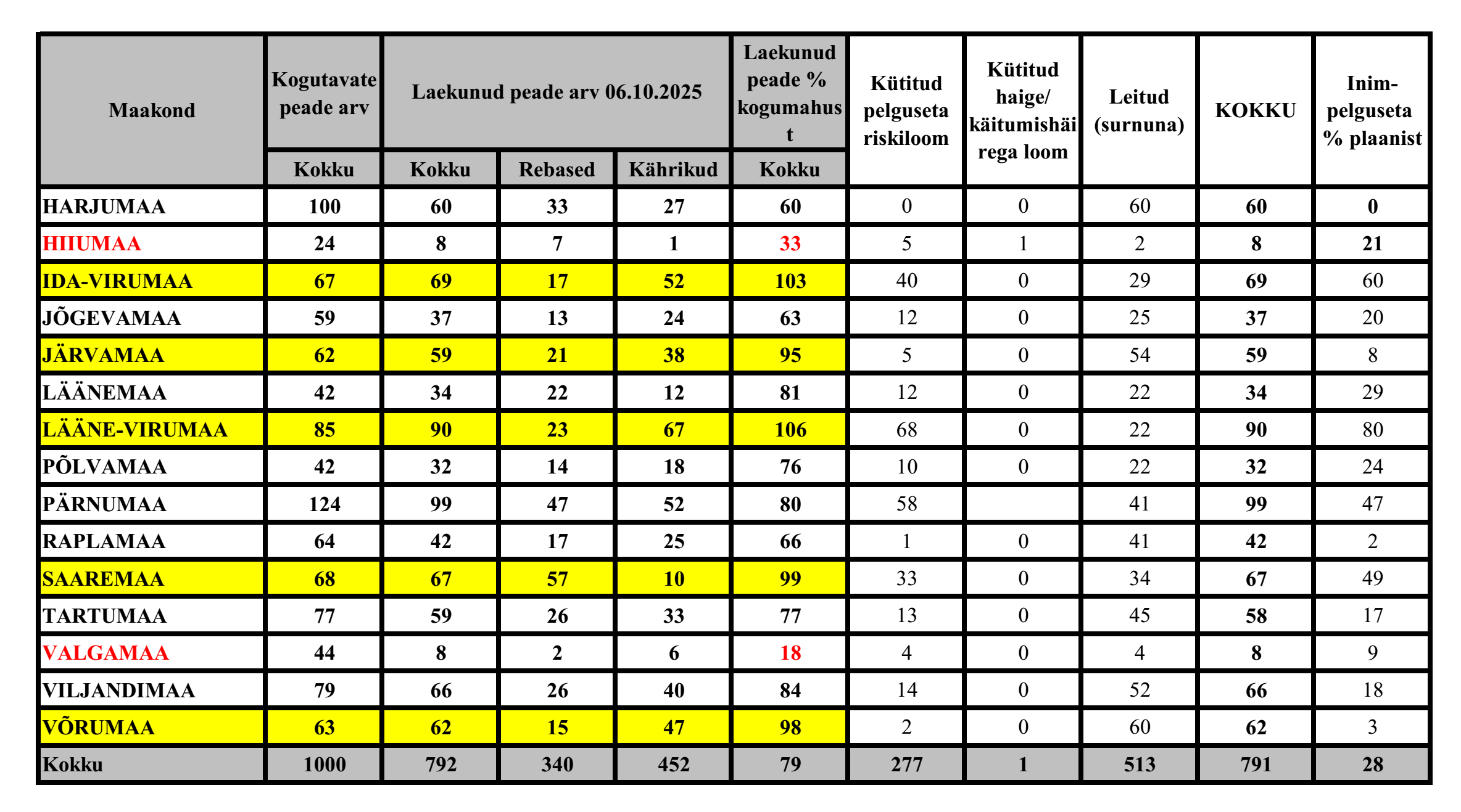 Nagu tabelist 1 näha, on 6.10.2025 seisuga kogutud 79% planeeritud riskiloomade proovidest.