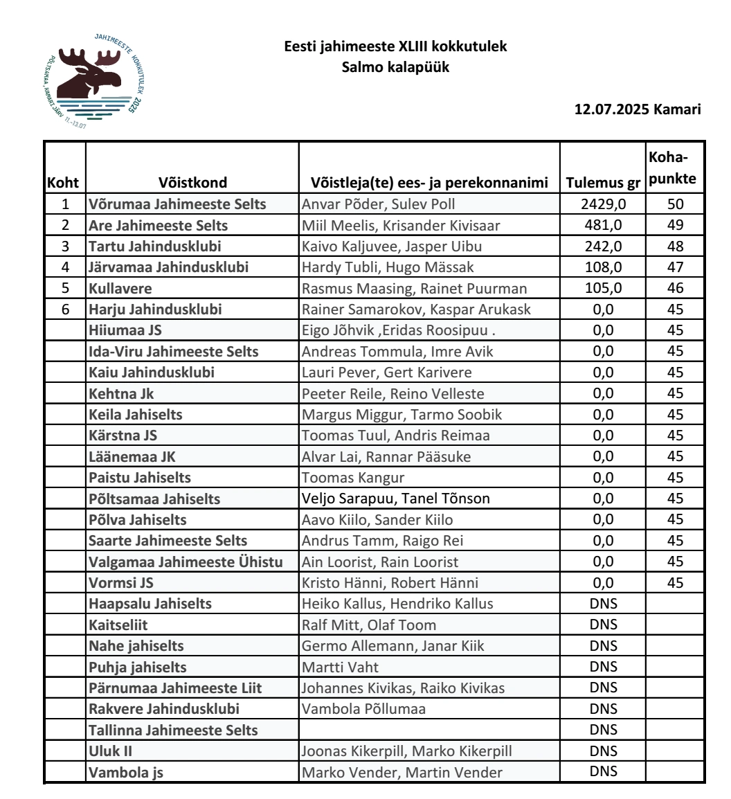 Avaleht Kokkutulek 2025 Kalapüügi tulemused on selgunud! Kokkutulek 2025Uudised Kalapüügi tulemused on selgunud! juuli 12, 2025 28 FacebookTwitterPinterestWhatsAppEmail Suurima kala saanud jahimees. Foto: EJS Varahommikust kalapüüki võeti tõsiselt, mida näitab pinev pingerida esikolmiku seas. Palju õnne võitjatele! Kokkutuleku info teated Kamaris tehti kokkuvõtteid sept. 19, 2025 Jahikoerad tõid jahimehed Kamaris saarele juuli 24, 2025 GALERII: jahimeeste kokkutulek 2025 versus 2009 juuli 23, 2025 Palume tagasisidet kokkutuleku kohta juuli 18, 2025 Põltsamaa valla ülevaade kokkutulekust juuli 17, 2025 Saarte jahimehed tõid kokkutulekult teise koha juuli 17, 2025 Offroader korraldas kokkutulekul vägeva põdraveo juuli 16, 2025 GALERII: Jahimeeste kokkutulek tõi kokku tuhandeid osalejaid ja pakkus elamusi igale maitsele juuli 15, 2025 Saarte Jahimeeste Seltsi ülevaade “mudarallilt” juuli 15, 2025 Kuningamäe kardikeskuses kuulutati välja kiireim jahimees ja jahinaine! juuli 15, 2025