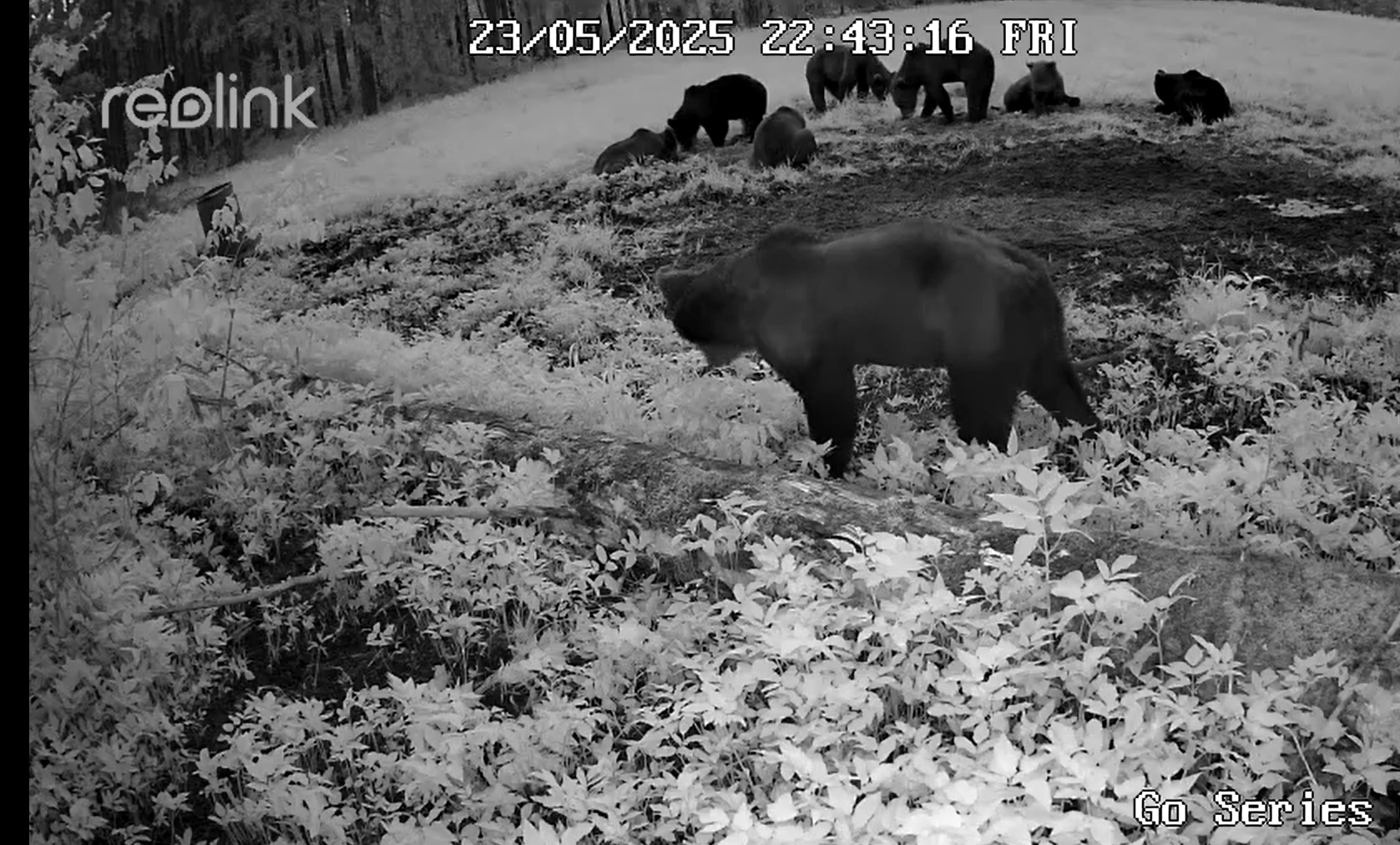 Rajakaamera omanik Kalle Adler käis hiljuti metsas mälukaarti vahetamas ja salvestistest selgus, et õhtul oli platsil juba kaheksa karu korraga.