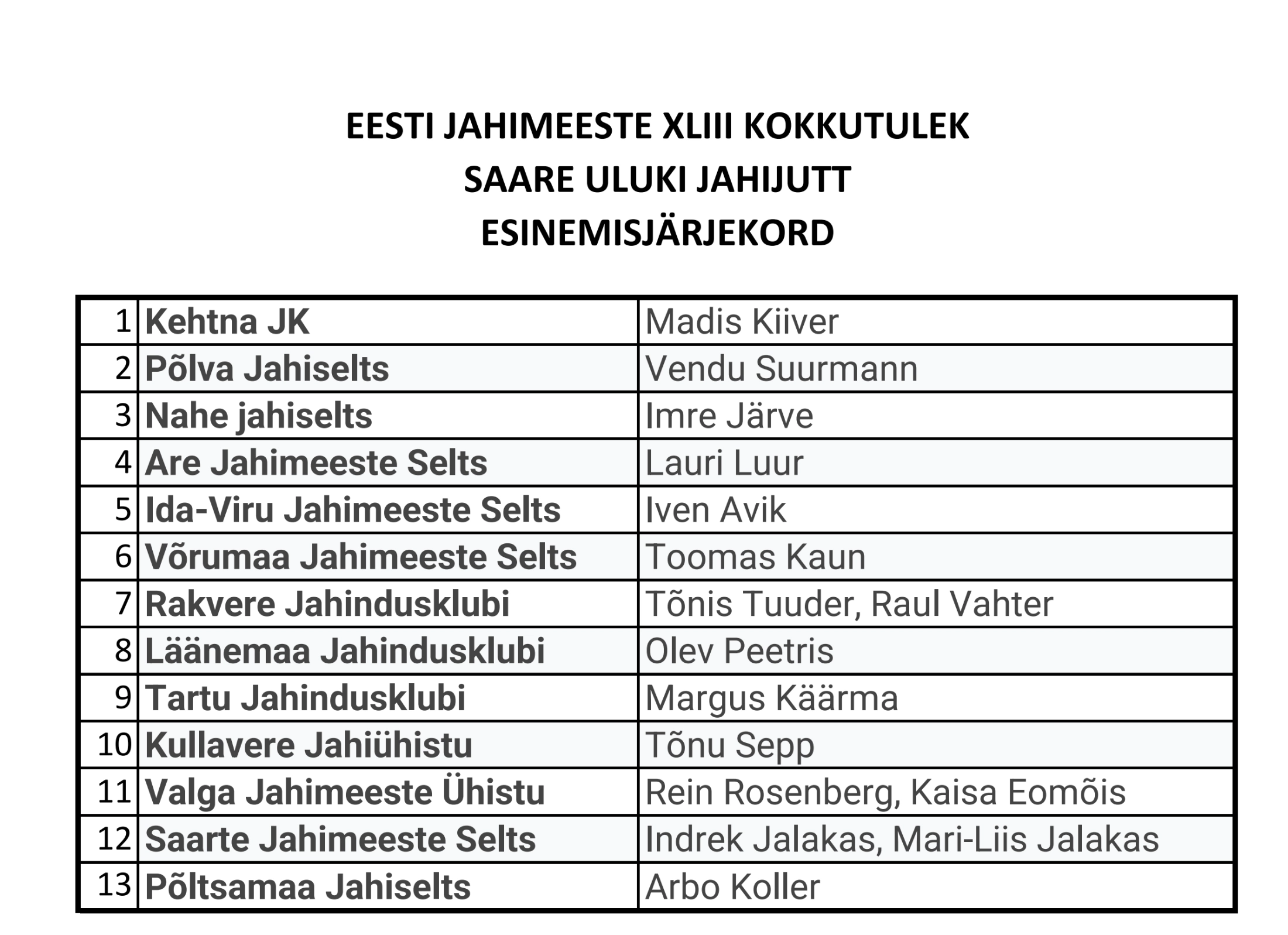 Avaleht Kokkutulek 2025 Kokkutuleku jahijutu järjekord Kokkutulek 2025Uudised Kokkutuleku jahijutu järjekord juuli 11, 2025 11 FacebookTwitterPinterestWhatsAppEmail Foto: EJS Kokkutulek hakkab vaikselt pihta ning seetõttu anname teada juba esimesest võistlusest. Jahijutu järjekord on järgmine: Kokkutuleku info teated Kamaris tehti kokkuvõtteid sept. 19, 2025 Jahikoerad tõid jahimehed Kamaris saarele juuli 24, 2025 GALERII: jahimeeste kokkutulek 2025 versus 2009 juuli 23, 2025 Palume tagasisidet kokkutuleku kohta juuli 18, 2025 Põltsamaa valla ülevaade kokkutulekust juuli 17, 2025 Saarte jahimehed tõid kokkutulekult teise koha juuli 17, 2025 Offroader korraldas kokkutulekul vägeva põdraveo juuli 16, 2025 GALERII: Jahimeeste kokkutulek tõi kokku tuhandeid osalejaid ja pakkus elamusi igale maitsele juuli 15, 2025 Saarte Jahimeeste Seltsi ülevaade “mudarallilt” juuli 15, 2025 Kuningamäe kardikeskuses kuulutati välja kiireim jahimees ja jahinaine! juuli 15, 2025