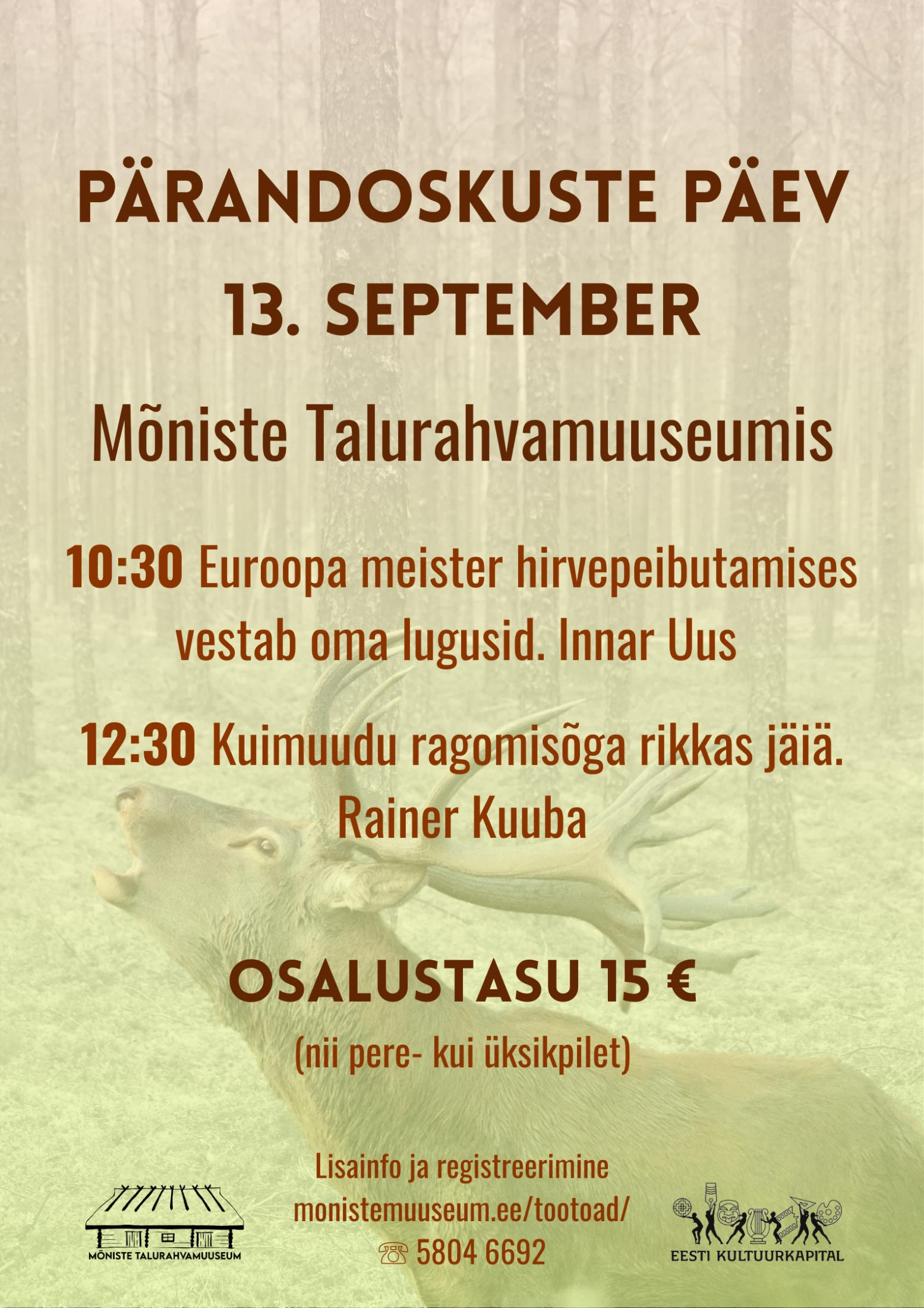13. septembril Mõniste talurahvamuuseumis toimuva pärandoskuste päeva keskmes on mets. Päeva alustab Innar Uus, tutvustades punahirve peibutamise kunsti ja Rainer Kuuba siib huvilised metsa.